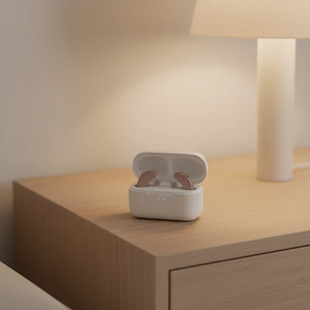 Olvídate de las pilas. Con su estuche compacto, tus audífonos siempre estarán listos. Carga rápida y sencilla en cualquier lugar.